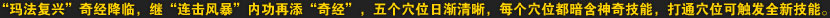 | 奇经是隐藏在人体诸多经脉之下的一条复杂且神奇的经脉,其上共有神冲、二百、夹脊、涌泉、八风五个穴位,每一个穴位都暗含神奇的效果,打通穴位可激发人体潜力,获得特殊的让人意想不到的某些能力,对于这些穴位进行挖掘修炼,可以提升对于特殊能力的掌握和升级。 | |